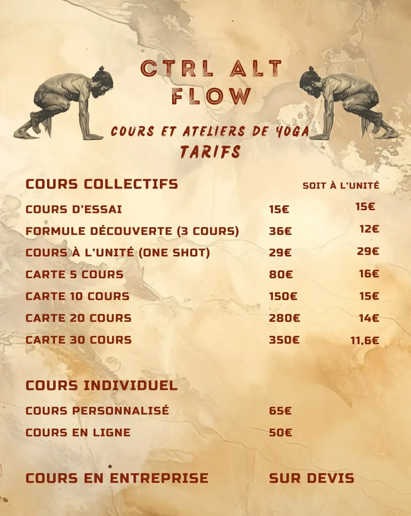 Ctrl Alt Flow propose des tarifs aussi justes que possible, afin que le yoga demeure une pratique abordable pour les élèves et rémunérer équitablement le professeur, tout en couvrant les frais de fonctionnement.